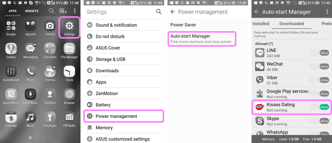 You need to allow our App to receive notifications by activating “Auto-start”. Start App Settings. Then go to “Power management” and search there for the Kisses App. Check if Auto-start is set to “Allow”. Otherwise you will not get any new messages. setup-mobile-power-manager
